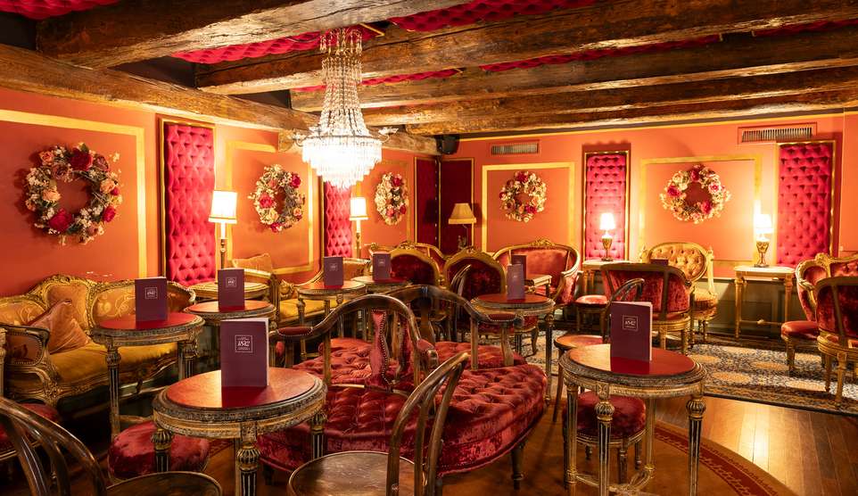 Der Salon Rouge ist ein Raum voller Charme und Eleganz – einzigartig in seiner Atmosphäre und perfekt für besondere Anlässe. Unter einer kunstvoll gestalteten Decke mit massiven Holzverstrebungen und samtbezogenen Kissen entfaltet sich eine Szenerie wie aus einer anderen Zeit: Kristallleuchter tauchen den Raum in warmes Licht, zinnoberrote Wände sind mit kunstvollen Goldrahmen geschmückt, und kleine Stehlampen mit cremefarbenen Stoffschirmchen sorgen für eine gemütliche, stilvolle Stimmung.